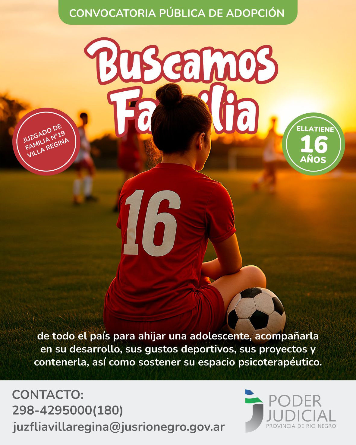 El Juzgado de Familia de la localidad de Villa Regina, Provincia de Río Negro, a través del Registro Único de Aspirantes a Guarda con Fines Adoptivos, convoca a familias que deseen adoptar a una adolescente de 15 años de edad.