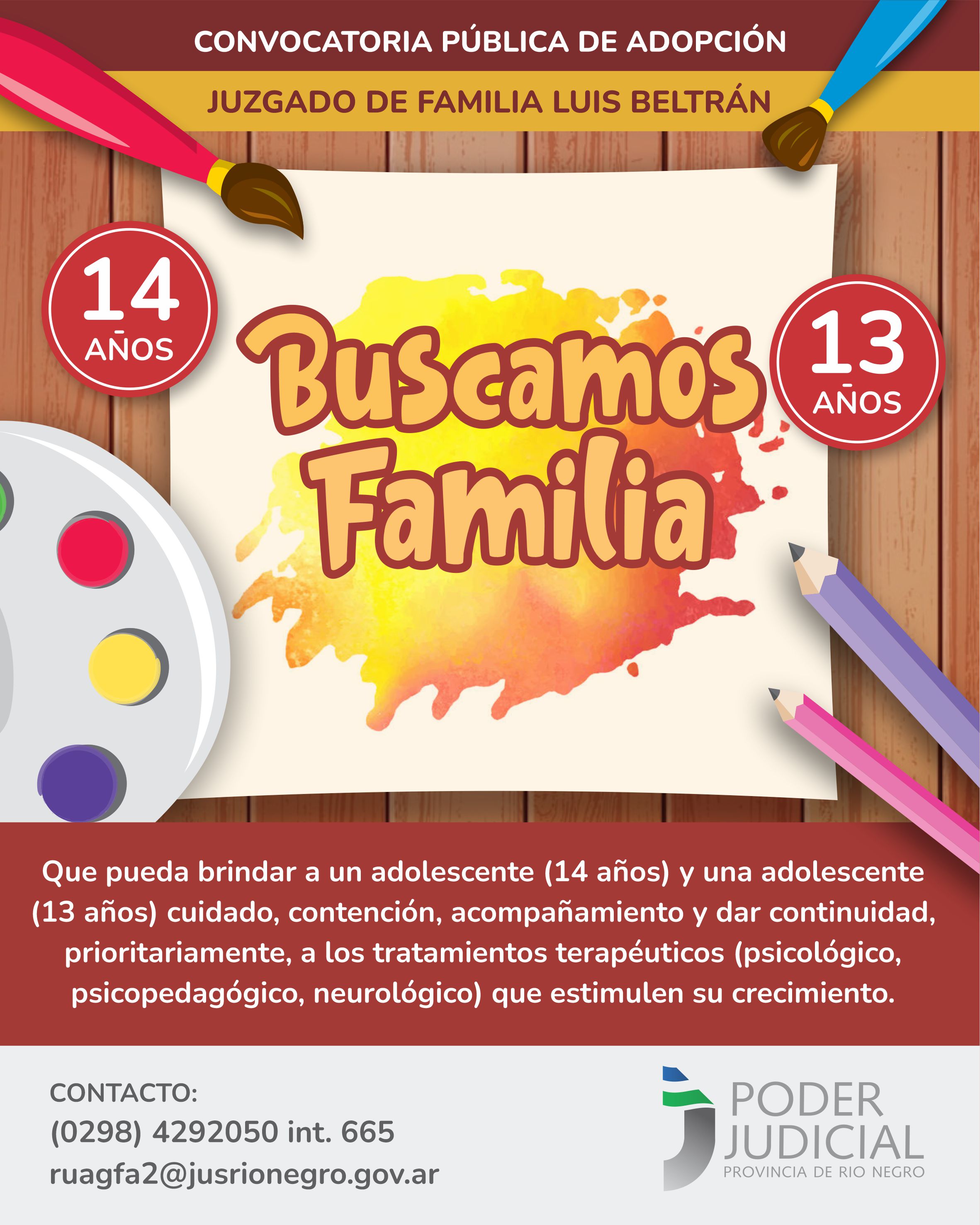 El Juzgado de Familia de Luis Beltrán , Provincia de Río Negro, a través del Registro Único de Aspirantes a Guarda con Fines Adoptivos, convoca a familias que quieran vincularse con un hermano y una hermana, que desean vivir juntos en familia.