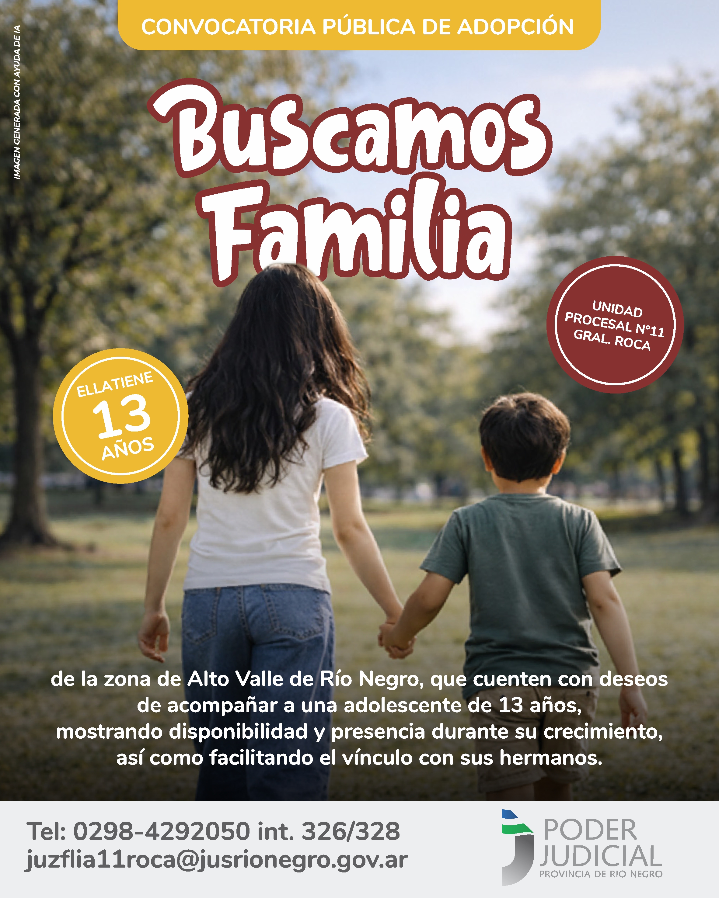 La Unidad Procesal N° 11 del Fuero de Familia de Gral. Roca, Provincia de Río Negro, a través del Registro Único de Aspirantes a Guarda con Fines Adoptivos, convoca a familias que deseen adoptar a una adolescente de 13 años de edad.