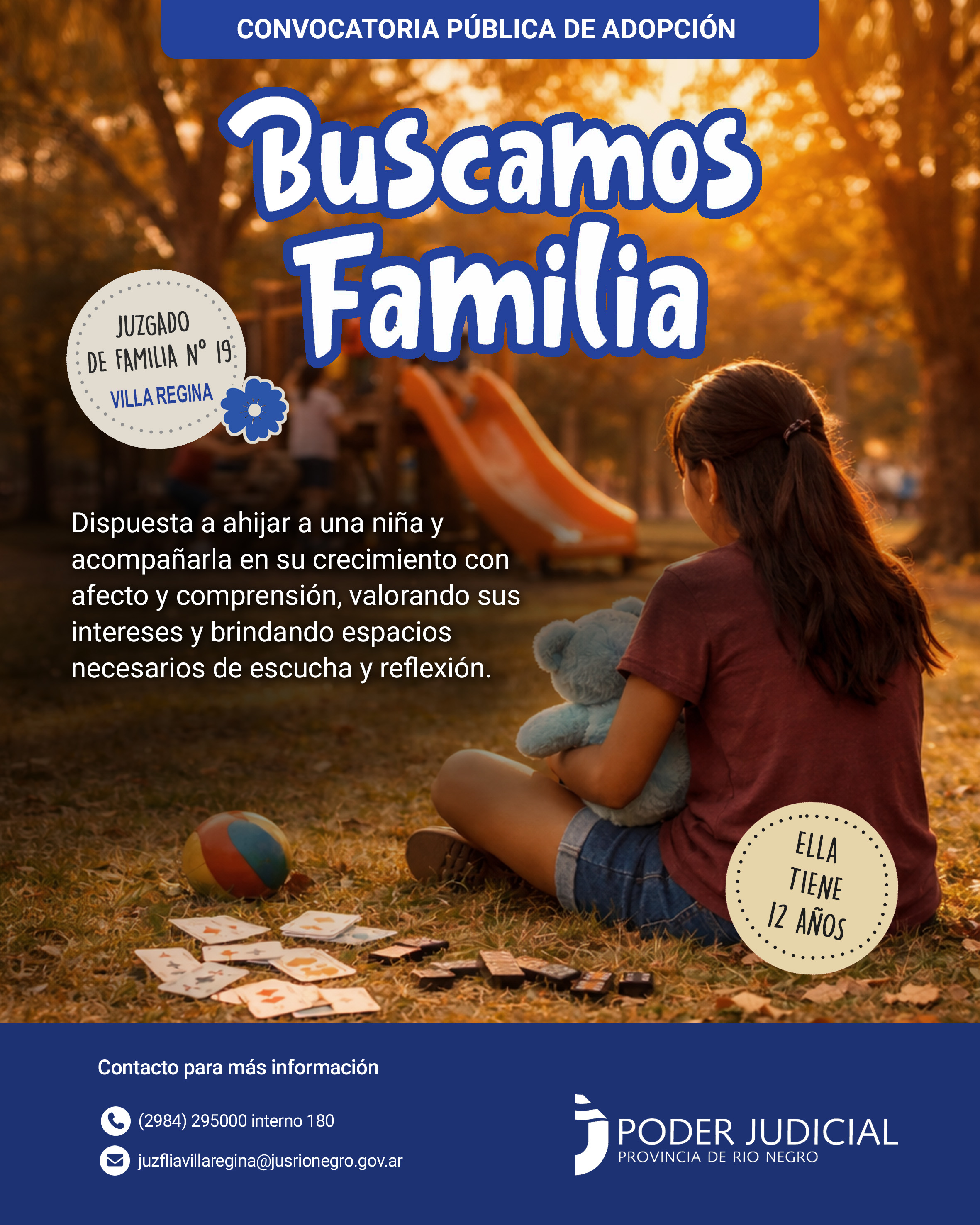 El Juzgado de Familia N°19 de Villa Regina, Provincia de Río Negro, a través del Registro Único de Aspirantes a Guarda con Fines Adoptivos, convoca a familias que deseen adoptar a una niña de 12 años.