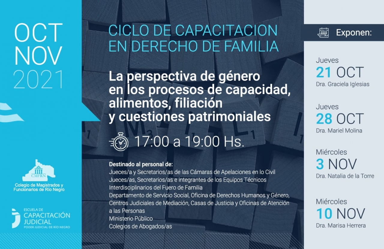 El eje del ciclo de capacitación será el análisis del Código Procesal del Fuero de Familia de Río Negro sobre los institutos de “patrimonio”, “capacidad”, “alimentos” y “filiación” y su abordaje desde la perspectiva de género.