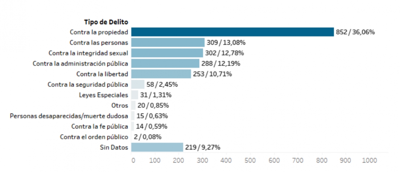 El hecho fue calificado bajo la figura penal de robo, que es considerado un delito contra la propiedad. En lo que va del año, el fuero Penal de Rio Negro registró 852 legajos por este tipo de delitos. También hubo 309 delitos contras las personas, 302 contra la integridad sexual y 288 contra la administración pública. En esta última categoría se incluyen, por ejemplo, las desobediencias a las prohibiciones de acercamiento en las causas de violencia de género.