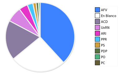- Columna Porcentaje sobre Válidos no toma en cuenta los votos en blanco ni nulos (usado para D'Hondt de corresponder).