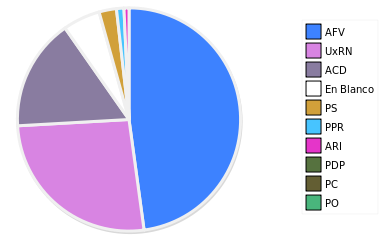 - Columna Porcentaje sobre Válidos no toma en cuenta los votos en blanco ni nulos (usado para D'Hondt de corresponder).