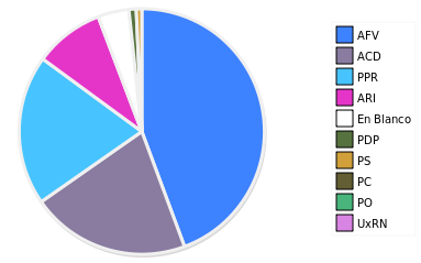 - Columna Porcentaje sobre Válidos no toma en cuenta los votos en blanco ni nulos (usado para D'Hondt de corresponder).