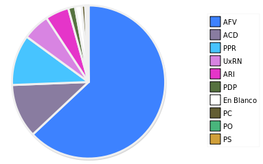 - Columna Porcentaje sobre Válidos no toma en cuenta los votos en blanco ni nulos (usado para D'Hondt de corresponder).