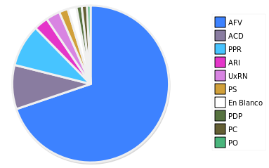 - Columna Porcentaje sobre Válidos no toma en cuenta los votos en blanco ni nulos (usado para D'Hondt de corresponder).