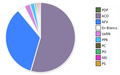 - Columna Porcentaje sobre Válidos no toma en cuenta los votos en blanco ni nulos (usado para D'Hondt de corresponder).