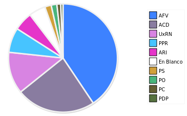 - Columna Porcentaje sobre Válidos no toma en cuenta los votos en blanco ni nulos (usado para D'Hondt de corresponder).