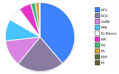 - Columna Porcentaje sobre Válidos no toma en cuenta los votos en blanco ni nulos (usado para D'Hondt de corresponder).