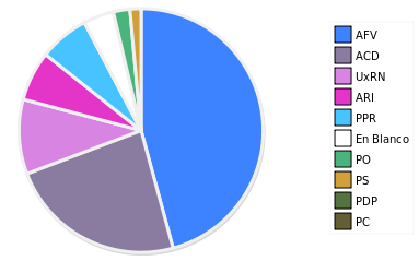- Columna Porcentaje sobre Válidos no toma en cuenta los votos en blanco ni nulos (usado para D'Hondt de corresponder).