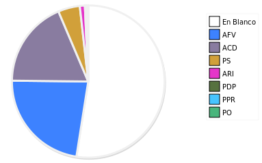 - Columna Porcentaje sobre Válidos no toma en cuenta los votos en blanco ni nulos (usado para D'Hondt de corresponder).