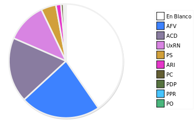 - Columna Porcentaje sobre Válidos no toma en cuenta los votos en blanco ni nulos (usado para D'Hondt de corresponder).