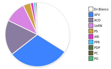 - Columna Porcentaje sobre Válidos no toma en cuenta los votos en blanco ni nulos (usado para D'Hondt de corresponder).