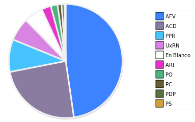- Columna Porcentaje sobre Válidos no toma en cuenta los votos en blanco ni nulos (usado para D'Hondt de corresponder).