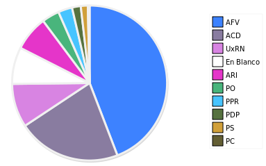 - Columna Porcentaje sobre Válidos no toma en cuenta los votos en blanco ni nulos (usado para D'Hondt de corresponder).