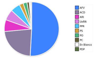 - Columna Porcentaje sobre Válidos no toma en cuenta los votos en blanco ni nulos (usado para D'Hondt de corresponder).