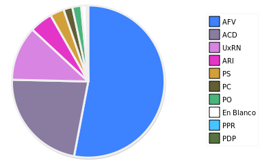 - Columna Porcentaje sobre Válidos no toma en cuenta los votos en blanco ni nulos (usado para D'Hondt de corresponder).