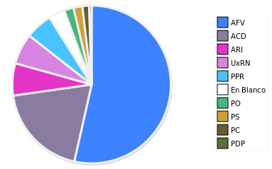 - Columna Porcentaje sobre Válidos no toma en cuenta los votos en blanco ni nulos (usado para D'Hondt de corresponder).