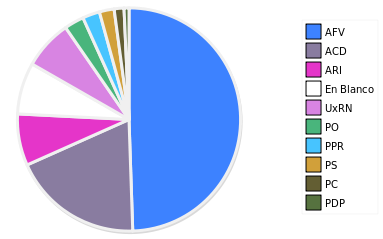 - Columna Porcentaje sobre Válidos no toma en cuenta los votos en blanco ni nulos (usado para D'Hondt de corresponder).