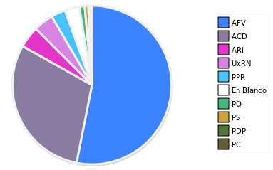 - Columna Porcentaje sobre Válidos no toma en cuenta los votos en blanco ni nulos (usado para D'Hondt de corresponder).