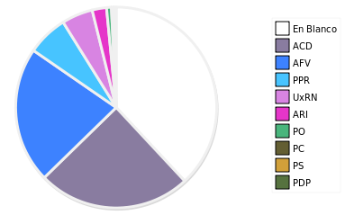 - Columna Porcentaje sobre Válidos no toma en cuenta los votos en blanco ni nulos (usado para D'Hondt de corresponder).