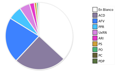 - Columna Porcentaje sobre Válidos no toma en cuenta los votos en blanco ni nulos (usado para D'Hondt de corresponder).
