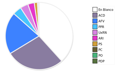 - Columna Porcentaje sobre Válidos no toma en cuenta los votos en blanco ni nulos (usado para D'Hondt de corresponder).