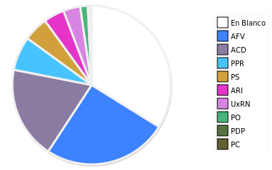 - Columna Porcentaje sobre Válidos no toma en cuenta los votos en blanco ni nulos (usado para D'Hondt de corresponder).