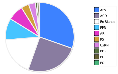 - Columna Porcentaje sobre Válidos no toma en cuenta los votos en blanco ni nulos (usado para D'Hondt de corresponder).