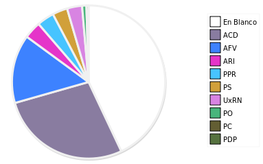 - Columna Porcentaje sobre Válidos no toma en cuenta los votos en blanco ni nulos (usado para D'Hondt de corresponder).