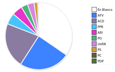 - Columna Porcentaje sobre Válidos no toma en cuenta los votos en blanco ni nulos (usado para D'Hondt de corresponder).