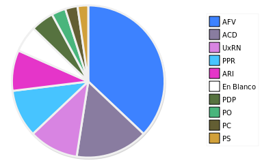- Columna Porcentaje sobre Válidos no toma en cuenta los votos en blanco ni nulos (usado para D'Hondt de corresponder).
