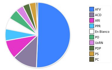 - Columna Porcentaje sobre Válidos no toma en cuenta los votos en blanco ni nulos (usado para D'Hondt de corresponder).