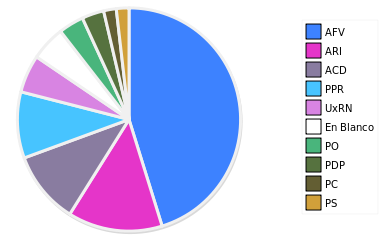 - Columna Porcentaje sobre Válidos no toma en cuenta los votos en blanco ni nulos (usado para D'Hondt de corresponder).
