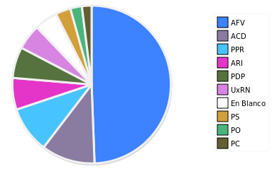 - Columna Porcentaje sobre Válidos no toma en cuenta los votos en blanco ni nulos (usado para D'Hondt de corresponder).
