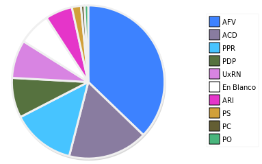 - Columna Porcentaje sobre Válidos no toma en cuenta los votos en blanco ni nulos (usado para D'Hondt de corresponder).