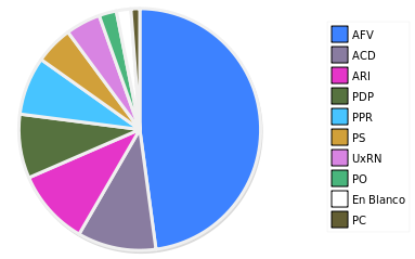 - Columna Porcentaje sobre Válidos no toma en cuenta los votos en blanco ni nulos (usado para D'Hondt de corresponder).