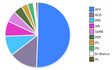 - Columna Porcentaje sobre Válidos no toma en cuenta los votos en blanco ni nulos (usado para D'Hondt de corresponder).