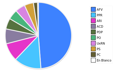 - Columna Porcentaje sobre Válidos no toma en cuenta los votos en blanco ni nulos (usado para D'Hondt de corresponder).