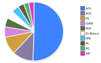 - Columna Porcentaje sobre Válidos no toma en cuenta los votos en blanco ni nulos (usado para D'Hondt de corresponder).