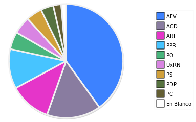 - Columna Porcentaje sobre Válidos no toma en cuenta los votos en blanco ni nulos (usado para D'Hondt de corresponder).