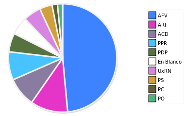 - Columna Porcentaje sobre Válidos no toma en cuenta los votos en blanco ni nulos (usado para D'Hondt de corresponder).