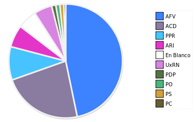 - Columna Porcentaje sobre Válidos no toma en cuenta los votos en blanco ni nulos (usado para D'Hondt de corresponder).