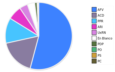 - Columna Porcentaje sobre Válidos no toma en cuenta los votos en blanco ni nulos (usado para D'Hondt de corresponder).