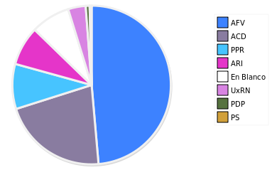 - Columna Porcentaje sobre Válidos no toma en cuenta los votos en blanco ni nulos (usado para D'Hondt de corresponder).