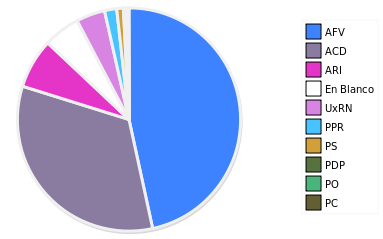 - Columna Porcentaje sobre Válidos no toma en cuenta los votos en blanco ni nulos (usado para D'Hondt de corresponder).