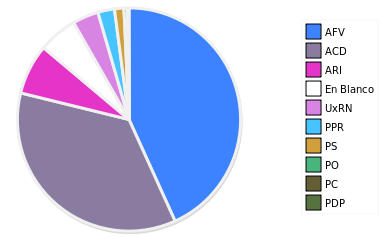 - Columna Porcentaje sobre Válidos no toma en cuenta los votos en blanco ni nulos (usado para D'Hondt de corresponder).