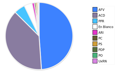 - Columna Porcentaje sobre Válidos no toma en cuenta los votos en blanco ni nulos (usado para D'Hondt de corresponder).