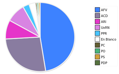 - Columna Porcentaje sobre Válidos no toma en cuenta los votos en blanco ni nulos (usado para D'Hondt de corresponder).